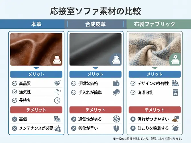 応接室の家具を選ぶ際は、素材やメンテナンス性にも目を向ける必要があります。ソファの素材としては、主に本革・合成皮革・布製(ファブリック)が採用されるケースが一般的です。