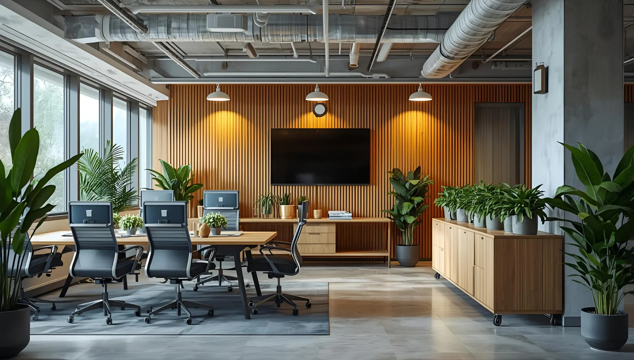 木材を使用した家具や内装は、温かみのある雰囲気を生み出し、オフィスにナチュラルな印象を与えます。